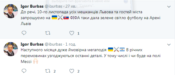 "В следующем месяце очень вероятно мега-событие. В переговорах, которые длятся уже год, согласовывает последние детали. В том числе, будет ли на поле Месси", - написал Игорь Бурбас.