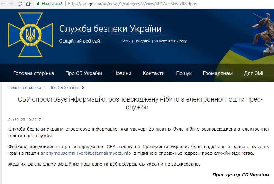 В сообщении сказано, что Служба безопасности Украины опровергает информацию, которая вечером 23 октября была якобы распространена с электронной почты пресс-службы СБУ. "Фейковое сообщение о предупреждении СБУ покушения на президента Украины, было отправлено с одной из соседних стран с почты anonymousemail@orbit.eternalimpact.info с настоящей подменой адреса пресс-службы ведомства. Никаких фактов взлома официальных почтовых и веб ресурсов СБ Украины не зафиксировано", - сказано в сообщении.