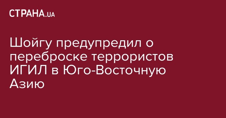 Министр обороны России Сергей Шойгу заявил о росте террористических угроз в Юго-Восточной Азии. Это происходит, в том числе, из-за ухода террористов ИГИЛ из Сирии и Ирака, передает РИА Новости.