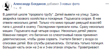 "Только что мимо прошел ревущий взахлеб папа с дочкой в охапку. Последними приехали копы. Сразу несколько машин. Подъехало еще четыре скорых. Несколько детей увезли. Мамочки говорят, что балончик со слезоточивый газом применил девятиклассник, чтобы уроки сорвать. Учителя бегают у входа со списками детей. Все службы разъехались. Осталась только полиция. Большая часть окон на 2-м и 3-ем этажах открыты. Проветривают".