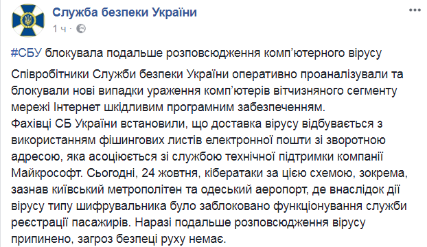 "Специалисты СБУ установили, что доставка вируса происходит с использованием фишинговых писем электронной почты с обратным адресом, которая ассоциируется со службой технической поддержки компании Microsoft. Сегодня, 24 октября, кибератаки по этой схеме, в частности, получил киевский метрополитен и одесский аэропорт, где в результате действия вируса типа шифровальщика было заблокировано функционирование службы регистрации пассажиров. Сейчас дальнейшее распространение вируса прекращено, угроз безопасности движения нет", - сказано в нем.