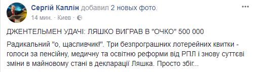Нардеп Сергей Каплин назвал выигрыш Ляшко "очередной декларационной аферой" и пригрозил обращением в НАБУ.