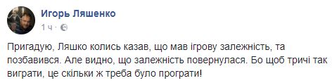 "Помню, Ляшко когда-то говорил, что имел игровую зависимость, и лишился. Но видно, что зависимость вернулась. Ведь чтобы трижды так выиграть, это сколько же надо было проиграть!", - написал в Facebook украинский журналист Игорь Ляшенко.