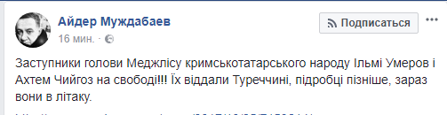 Чийгоза и Умерова сначала привезли в Симферополь, затем самолет забрал их в Анапу, а около часа назад самолет с представителями Меджлиса крымскотатарского народа отправился в Анкару.