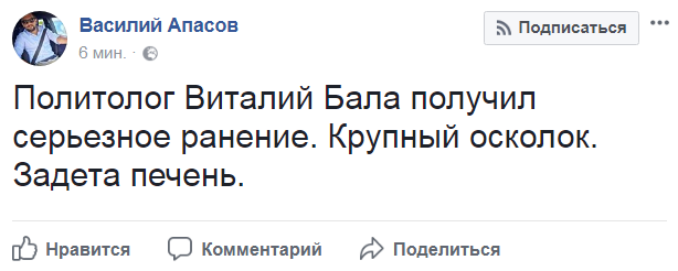 В результате вероятного покушения на нардепа Игоря Мосийчука, находившийся рядом с ним политолог Виталий Бала получил серьезное ранение. В него попал крупный осколок, задета печень.