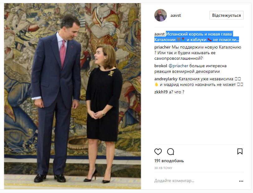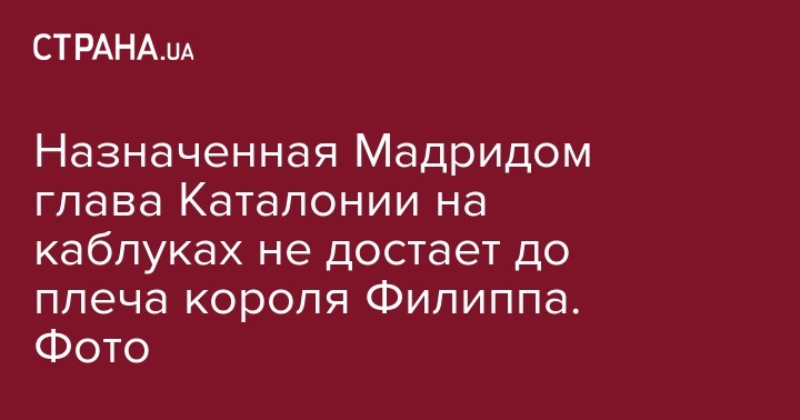 В Интернете опубликовано фото, на котором запечатлены король Испании Филипп VI и Сорайя Саэнс де Сантамария, которую накануне назначили главой Каталонии вместо мятежного Карлеса Пучдемона. На фото, которое опубликовал главный редактор "Эха Москвы" Алексей Венедиктов в своем Instagram, Сорайя на высоких шпильках не достает даже до плеча короля.