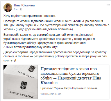 Президент Петр Порошенко подписал закон "О внесении изменений в закон "О бухгалтерском учете и финансовой отчетности в Украине"(относительно усовершенствования некоторых положений). Об этом написала председатель Комитета Верховной Рады по вопросам налоговой и таможенной политики Нина Южанина на своей странице в Facebook.