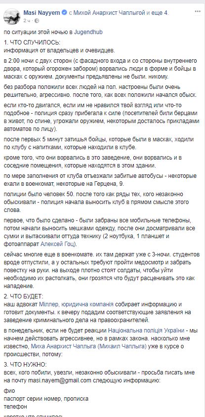 ""В 2:00 ночи с двух сторон (с фасадного входа и со стороны внутреннего двора, который огорожен забором) ворвались люди в форме и бойцы в масках с оружием. документы предъявлены не были. Никому. Без разбора положили всех людей на пол. настроены были очень решительно, агрессивно. После того, как всех положили начался обыск. если кто-то двигался, если им не нравился твой взгляд или что-то подобное - полиция сразу прибегала к силе (посетителей били берцами в живот, по спине, угрожали оружием, некоторым досталось прикладами автоматов по лицу)" - пишет Найем.
