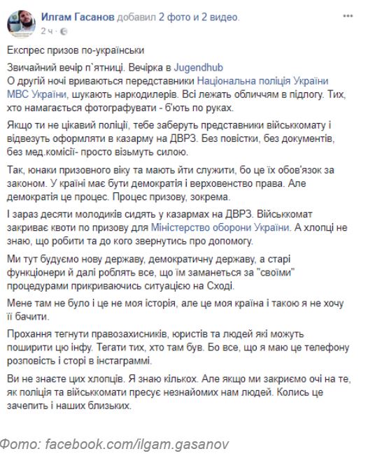 "В два часа ночи врываются представители полиции, ищут наркодилеров. Все лежат лицом в пол. Тех, кто пытается фотографировать - бьют по рукам. Если ты не интересен полиции, тебя заберут представители военкомата и отвезут оформлять в казарму на ДВРЗ (жилмассив в Киеве - ред.). Без повестки, без документов, без медкомисии - просто возьмут силой", - написал Гасанов.