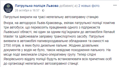 Сначала экипаж патрульной полиции заметил три автобуса, которые перевозят работников одного из предприятий Львовской области. Они один за другим подъезжали к автомобилю Renault Master и осуществляли его заправку.