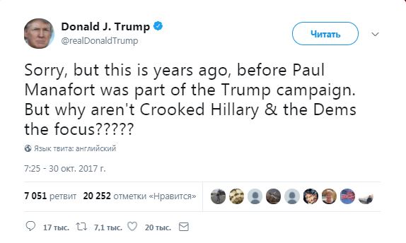 "Сорри, но это было годы назад, до того, как Пол Манафорт стал частью кампании Трампа", — отметил американский лидер в Twitter. Трамп также задался вопросом, "почему никто не следит за (деятельностью) бесчестной Хиллари (Клинтон) и демократов".