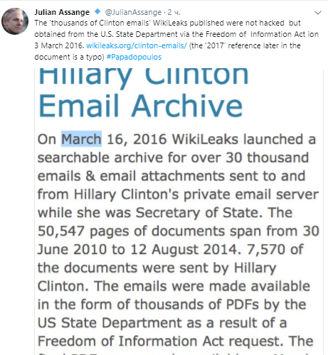 "Тысячи электронных сообщений Клинтон, опубликованные Wikileaks, не были взломаны, а получены в госдепе США на основе Закона о свободе информации 3 марта 2016 года", - заявил Ассанж в Twitter.