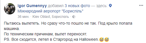 "Пытаюсь вылететь. Но сразу что-то пошло не так. Под крыло попала машина. По техническим причинам, вылет переносят. Все сходится, летел в Старгород на Halloween", - написал пассажир и опубликовал соответствующие фото.