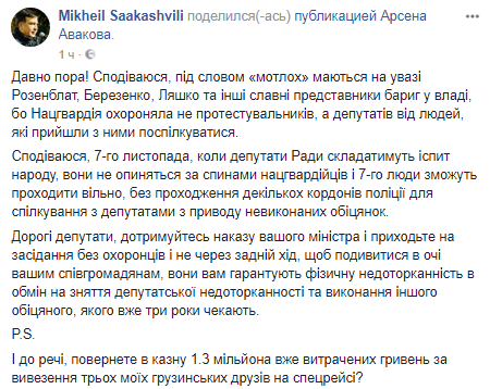 Также он спросил, будут ли возвращены в казну 1,3 миллиона уже потраченных гривен за вывоз трех его грузинских друзей на спецрейсе.