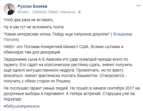 Руслан Бизяев, политолог: " Ну и как тут не вспомнить поэта. "Какая интересная эпоха, Пойду еще патронов докуплю" ( Владимир Полуев). НАБУ -это Потомак.Конкретней-Минюст США. Всякие сытники и ебаноидзе там для декораций.