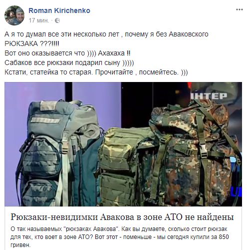 Роман Кирченко, боец АТО: "А я то думал все эти несколько лет, почему я без Аваковского РЮКЗАКА ???!!!! Вот оно оказывается что )))) Ахахаха !! Сабаков все рюкзаки подарил сыну".