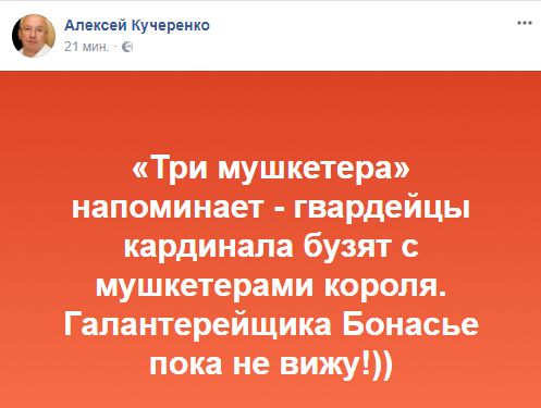 Алексей Кучеренко, экс-министр ЖКХ: "Три мушкетера" напоминает - гвардейцы кардинала бузят с мушкетерами короля. Галантерейщика Бонасье пока не вижу!"