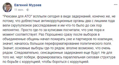Евгений Мураев, народный депутат: "Рюкзаки для АТО" всплыли сегодня в виде задержаний, конечно же, не потому, что доблестные антикоррупционные органы два с лишним года вели скрупулезное расследование и им что-то было до сих пор непонятно. Просто где-то за кулисами посчитали, что уже пора и момент соответствует. Раз Порошенко сразу после выборов в объединенные общины начал пожирать уже и партнеров по коалиции, значит, началось большое переформатирование политического поля. Значит, основные выборы где-то рядом, вполне возможно, что очень рядом. Следовательно, сенсационные задержания еще будут. Не для того же, черт побери, формировалась параллельная силовая структура по борьбе с коррупцией, чтобы бороться с коррупцией".