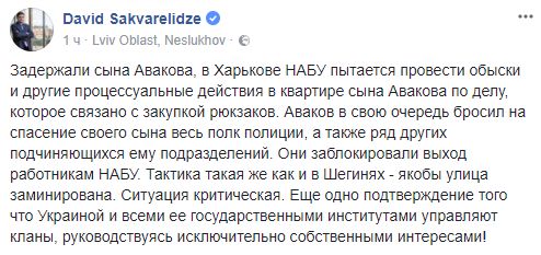 Давид Сакварелидзе, бывший заместитель генпрокурора: "задержали сына Авакова, в Харькове НАБУ пытается провести обыски и другие процессуальные действия в квартире сына Авакова по делу, которое связано с закупкой рюкзаков. Аваков в свою очередь бросил на спасение своего сына весь полк полиции, а также ряд других подчиняющихся ему подразделений. Они заблокировали выход работникам НАБУ. Тактика такая же как и в Шегинях - якобы улица заминирована. Ситуация критическая. Еще одно подтверждение того что Украиной и всеми ее государственными институтами управляют кланы, руководствуясь исключительно собственными интересами!"
