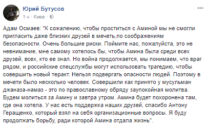 "К сожалению, чтобы проститься с Аминой мы не смогли пригласить даже близких друзей в мечеть, по соображениям безопасности. Очень большие риски. Поймите нас, пожалуйста, это не невнимание, мне самому хотелось бы, чтобы Амина была среди всех друзей, всех, кто ее знал. Но война продолжается, мы понимаем, что враг рядом, и российские спецслужбы могут использовать трагедию, чтобы совершить новый теракт. Нельзя подвергать опасности людей. Поэтому в мечети было несколько человек", - пояснил он.
