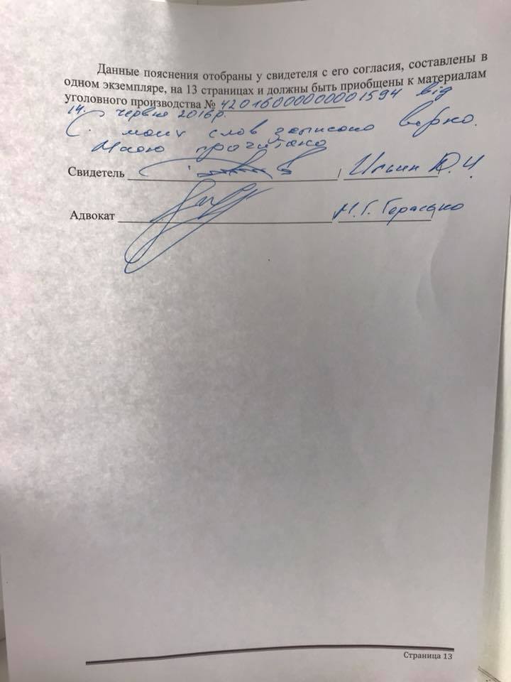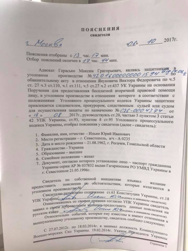 В показаниях Ильин подтверждает адвокату Герасько о готовности выступить в качестве свидетеля в деле о госизмене Януковича, которое сейчас рассматривается в Оболонском районном суде Киева.