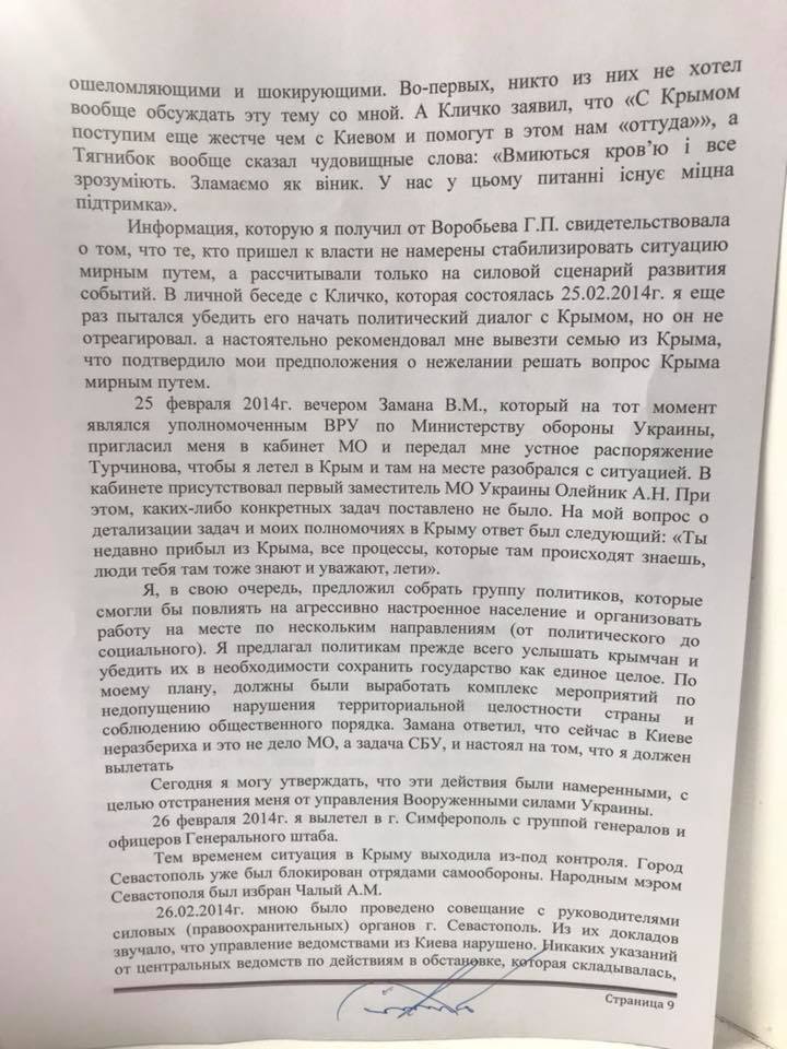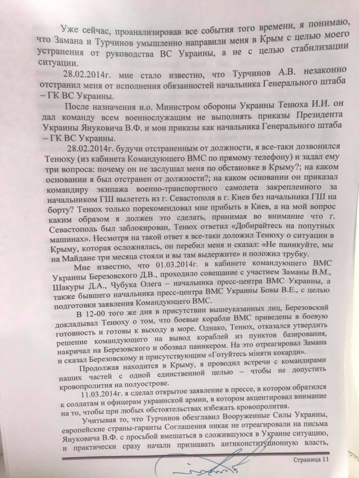"27.02.2014 в 04.30 после получения мною доклада от оперативного дежурного ГКЦ ВС Украины о захвате неизвестными административных и государственных учреждений в г. Симферополе я отдал устное распоряжение на приведение Вооруженных Сил Украины в боевую готовность "ПОЛНАЯ". Об этом я доложил Замане В.М., который на тот момент занимал должность Уполномоченного ВРУ по вопросам МО Украины", - говорится в показаниях экс-главы Генштаба. Далее он утверждает: "По моей информации Заманой В.М., по согласованию с Турчиновым, в тот же день, было принято решение понизить степень готовности войск в Крыму с "ПОЛНОЙ" до "ПОСТОЯННОЙ" о чем командование ВМС Украины получило соответствующую телеграмму за подписью генерал-полковника Воробьева Г.П.".