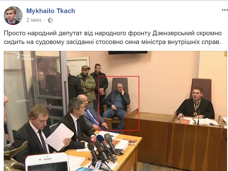 В зале также находится нардеп от Народного фронта Денис Дзерзерский. Он сидит на "почетном" месте справа от судьи. В зале столько народу, что сидят лишь участники процесса. И нардеп Дзензерский.