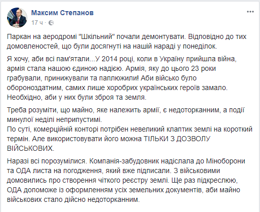 Одесский губернатор Максим Степанов заявил, что конфликт ВСУ и бывших АТОшников вокруг аэродрома "Школьный" в Одессе уже улажен. Об этом он написал в Facebook.