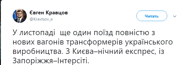 "В ноябре еще один поезд полностью из новых вагонов-трансформеров украинского производства. Из Киева — ночной экспресс, из Запорожья — Интерсити", – написал Кравцов.