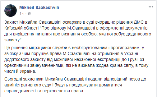 "Защита Михаила Саакашвили обжаловала в суде вчерашнее решение государственной миграционной службы в Киевской области "Об отказе М. Саакашвили в оформлении документов для решения вопроса о признании лицом, которое требует дополнительной защиты", - написал политик.