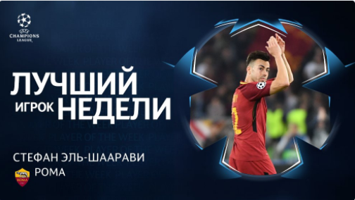 Нападающий "Ромы" Стефан Эль-Шаарави был признан игроком недели в Лиге чемпионов. Форвард отметился дублем в матче 4-го тура группового этапа Лиги чемпионов с "Челси" (3:0). Вторым стал хавбек "Ливерпуля" Мохамед Салах. Полузащитник ЦСКА Алан Дзагоев в ходе голосования занял третье место.
