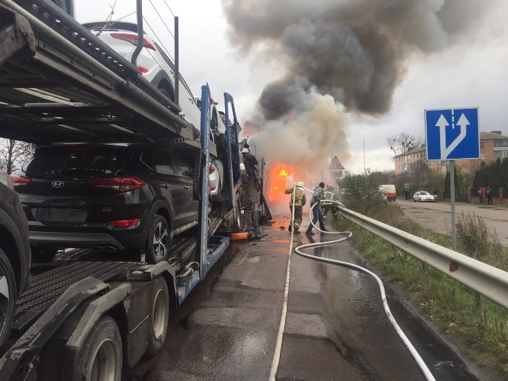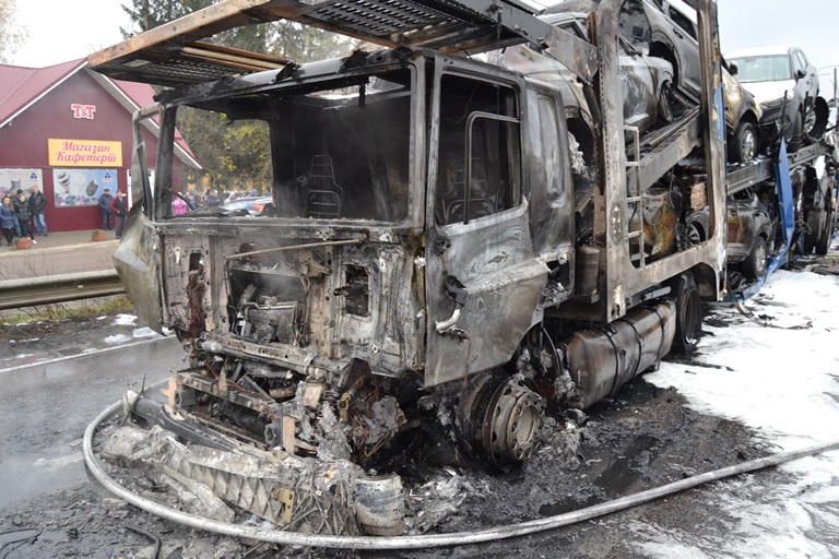 В 13.10 пожар удалось локализовать, а  в 14:30 – полностью потушить. Огнем уничтожена кабина водителя, моторный отсек автомобиля DAF и шесть легковых автомобиля марки Hyundai Tucson.