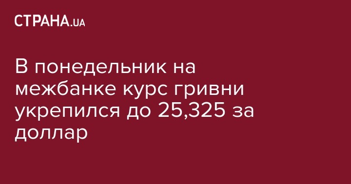 Курс гривни на межбанковском валютном рынке в понедельник укрепился до 25,325 грн/$1 по сравнению с 25,35 грн/$1 к завершению торгов в предыдущий рабочий день, сообщили агентству "Интерфакс-Украина" дилеры коммерческих банков.