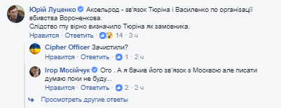 В комментарии под постом нардепа Игоря Мосийчука о личности расстрелянного в Харькове коммерсанта, Луценко отметил, что "Аксельрод - связь Тюрина и Василенко по организации убийства Вороненкова. Следствие ГПУ верно определило Тюрина как заказчика".
