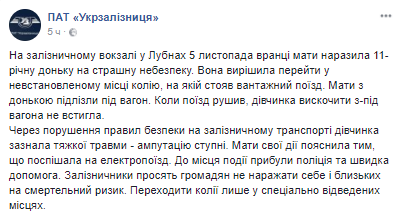 На железнодорожном вокзале в Лубнах Полтавской области мать с 11-летней дочерью пострадали, пытаясь перелезть участок дороги под вагоном. В результате девочка сильно пострадала. Об этом сообщает "Укрзализныця" в Facebook.