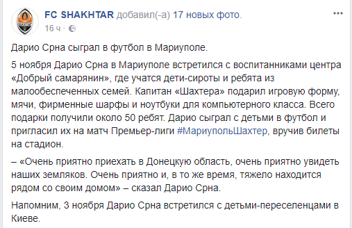 Напомним, что накануне Дарио Срна и в Киеве подарил мячи и форму детям переселенцев из Донбасса.