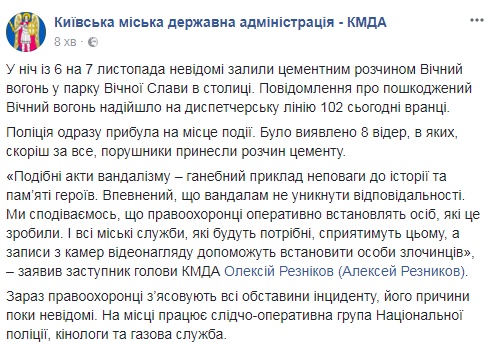 Полиция сразу прибыла на место происшествия. Было выявлено 8 ведер, в которых, скорее всего, нарушители принесли раствор цемента", - говорится в заявлении КГГА.