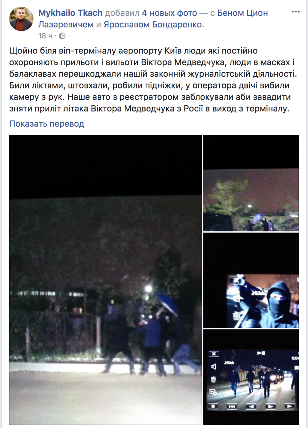"Только что у вип-терминала аэропорта Киев люди, которые постоянно охраняют прилеты и вылеты Виктора Медведчука, люди в масках и балаклавах препятствовали нашей законной журналистской деятельности", - написал он.