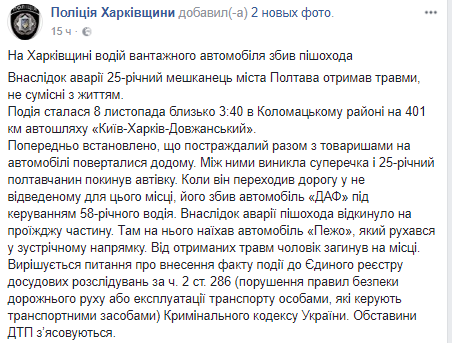 Трагедия произошла на 401 км автодороги Киев-Харьков-Довжанский. Предварительно установлено, что погибший вместе с товарищами на автомобиле возвращались домой. Между ними возник спор, и мужчина оставил машину. Когда он переходил дорогу в не предназначенном для этого месте, его сбил автомобиль. Пешехода отбросило на проезжую часть, где на него наехал другой автомобиль Peugeot. От полученных травм мужчина погиб на месте.
