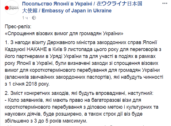 "По случаю визита государственного министра иностранных дел Японии Кадзуюки Накане в Киев 9 ноября этого года для переговоров с его партнерами в правительстве Украины и для участия в событиях в рамках года Японии в Украине, были определены меры по упрощению визовых требований для краткосрочного пребывания для граждан Украины (владельцев обычных загранпаспортов), которые вступят в силу с 1 января 2018 года", - говорится в опубликованном сообщении.