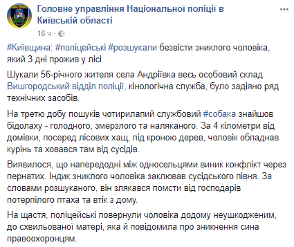 Полицейские Киевской области нашли без вести пропавшего мужчину, который три дня прожил в лесу. Об этом сообщает пресс-служба полиции в Facebook.
