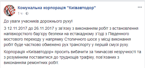 В Киеве почти на полмесяца ограничат автомобильное движение на эстакадном съезде с Южного моста в направлении Столичного шоссе. Об этом сообщает "Киевавтодор" в Facebook.