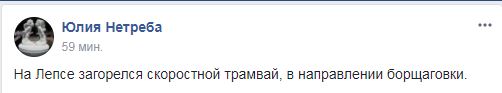 "На Лепсе загорелся скоростной трамвай, в направлении Борщаговки", - пишет местная жительница Юлия Нетреба.