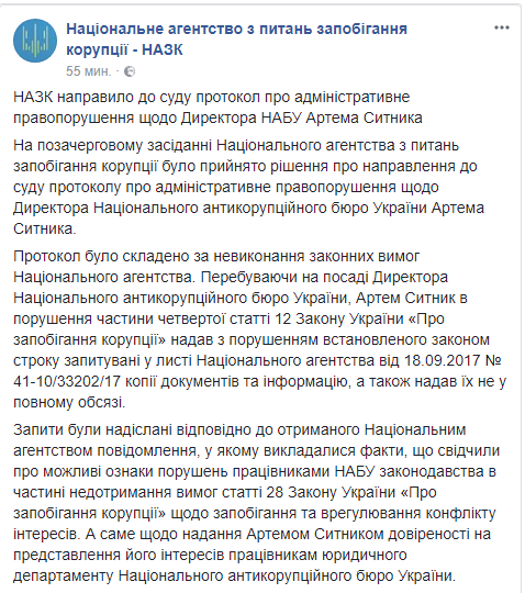 По версии НАПК, таким образом Сытник совершил административное правонарушение, посягающее на установленный порядок управления.