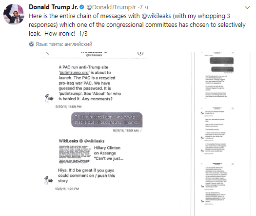 Старший сын Дональда Трампа поддерживал контакты с Wikileaks во время избирательной кампании отца. Об этом Трамп-младший сообщил в Twitter.