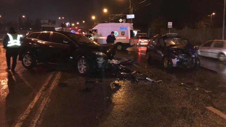 Авария произошла в Святошинском районе Киева, на пересечении улиц Стеценко и Туполева. Водитель "Мазды" выехал на встречную и столкнулся в лоб с миниатюрным "Митсубиши Кольт".