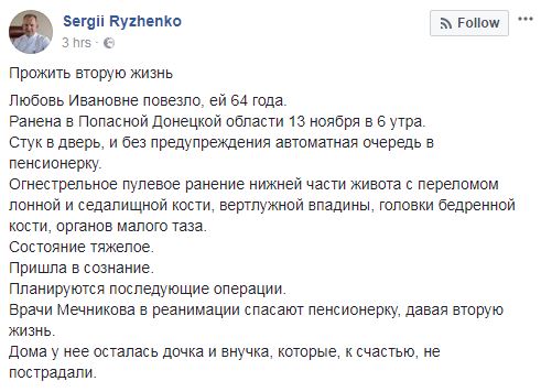 "Прожить вторую жизнь. Любовь Ивановне повезло, ей 64 года. Раненая в Попасной Донецкой области 13 ноября в 6 утра", - написал он.