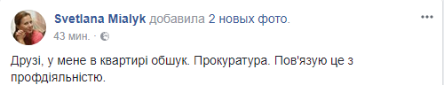 В комментариях к посту журналистки в Facebook внезапно отписалась пресс-секретарь СБУ Елена Гитлянская. Она пишет, что это дело не СБУ, а прокуратуры, и самой Мялик оно не касается.