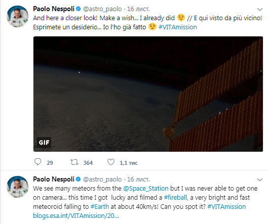 "На МКС мы наблюдаем много метеоритов, но мне никогда не удавалось заснять их на камеру. В этот раз мне повезло, и я запечатлел яркий огненный шар. Им оказался очень быстрый метеорит, который двигался со скоростью 40 километров в секунду", - написал Несполи.