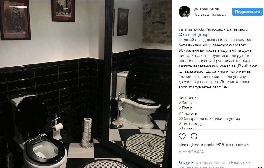 В Instagram появился аккаунт с обзорами туалетов в заведениях Киева, который называется "Я щас приду". Пока на странице всего три поста.